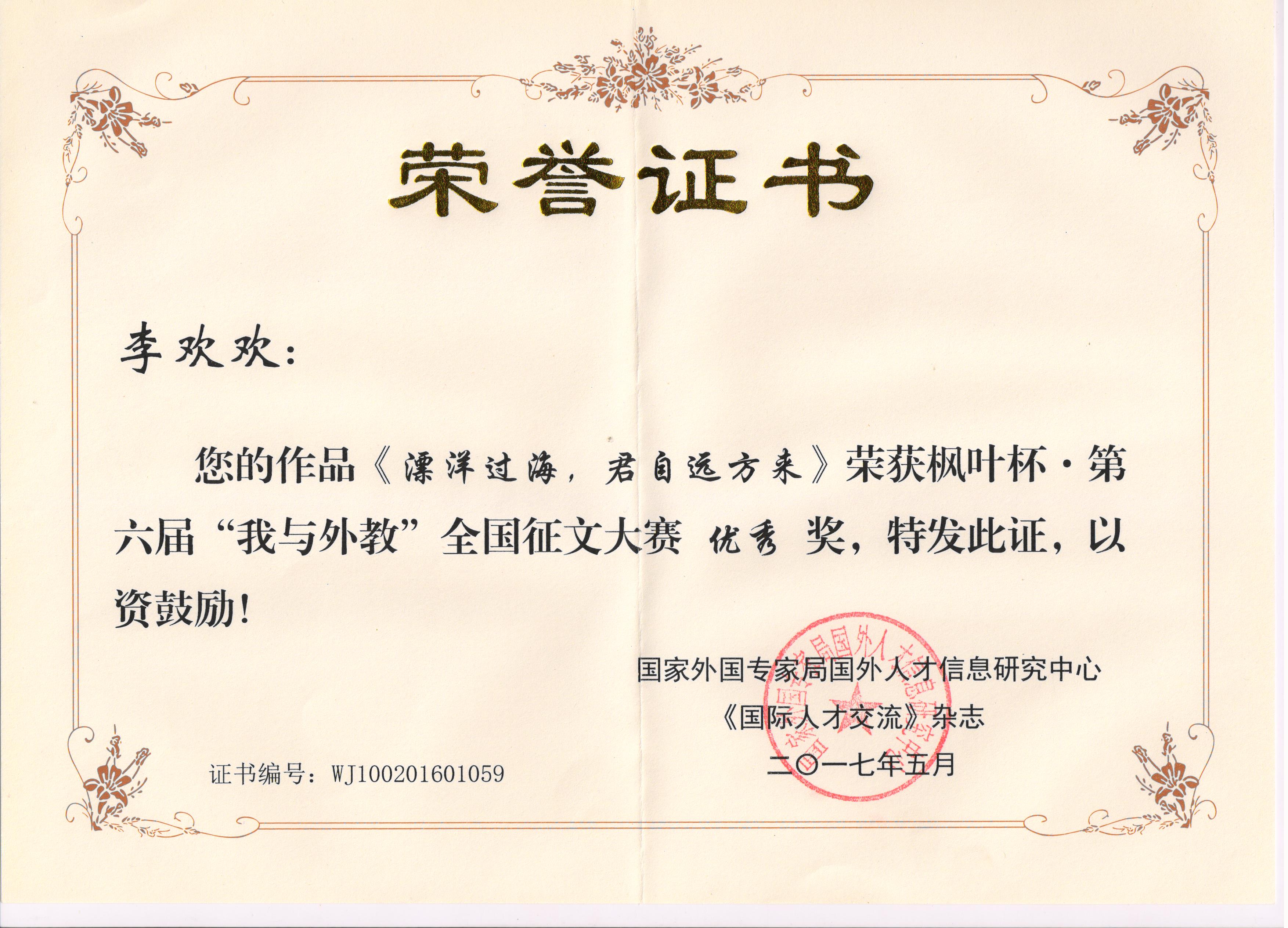 pp电子在“枫叶杯”2016“我与外教”全国征文大赛中喜获佳绩