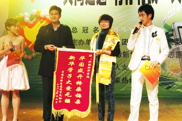 在晚会现场,格桑花西部助学全国高校负责人俞可涛代表青海省格桑花教育救助会向我院赠送了锦旗,“华园盛开格桑梅朵、新华学子大爱无疆”充分的肯定了我院在格桑花安徽省高效工作站成立以来两年里所做出的贡献。我院团委老师,青年志愿者协会指导老师也表示,能参与格桑花西部助学活动是志愿者们的一份荣誉,更是志愿者们的一份责任,在以后的日子里,志愿者们会继续努力做好格桑花西部助学工作,让格桑花精神真正传播到每一个角落。(文/王帆)