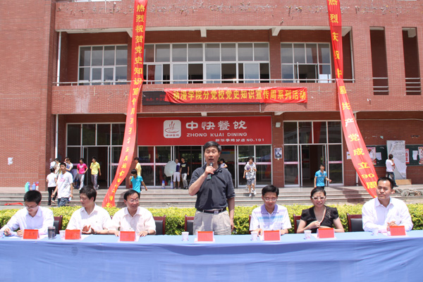 为庆祝中国共产党成立90周年,引导和帮助广大党员重温中国共产党光辉历程,了解党领导人民建立新中国和进行社会主义现代化建设的伟大成就,激发爱党、爱国、爱社会主义的热情,坚定共产主义理想信念,由动漫学院党总支主办、动漫学院分党校第二期入党积极分子培训班承办的 “党史知识宣传周系列活动”于5月9日中午正式启动。督导专员、学院党委书记方向明,学院党委委员、动漫学院党总支书记、院长孙家启,动漫学院党总支副书记、行政副院长朱诵贵出席了启动仪式,动漫学院全体党员和动漫学院分党校第二期入党积极分子培训班的全体学员参加了仪式。