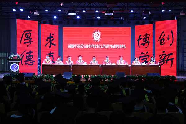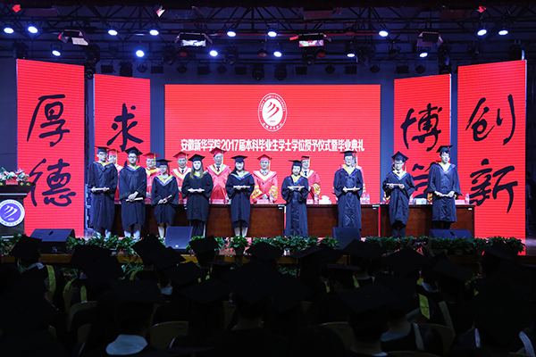 新华集团常务副总裁、学校董事长陆真,新华集团副总裁、学校董事黄源,省督导专员、学校党委书记储国定,校长石秀和,副校长杨世国、王可、李金星、王丽,校长助理朱兆健与毕业生代表一一握手,为他们颁发学士学位证书、扶正流苏,祝贺他们顺利完成大学四年的学业。