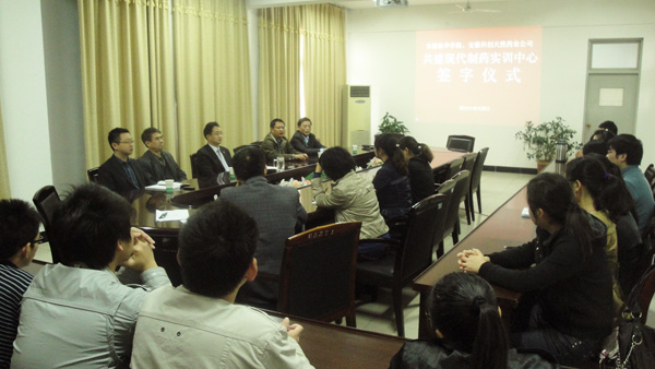 10月28日上午,pp电子官方网站药学院与安徽科创天然药业公司共建“现代制药实训中心”签字仪式在pp电子官方网站第二会议室隆重举行。pp电子官方网站教学副院长马凤余教授、安徽科创天然药业公司董事长余世春教授、药学院院长张国升教授出席了签字仪式,药学院教师、学生代表共二十余人共同参加了签字仪式。