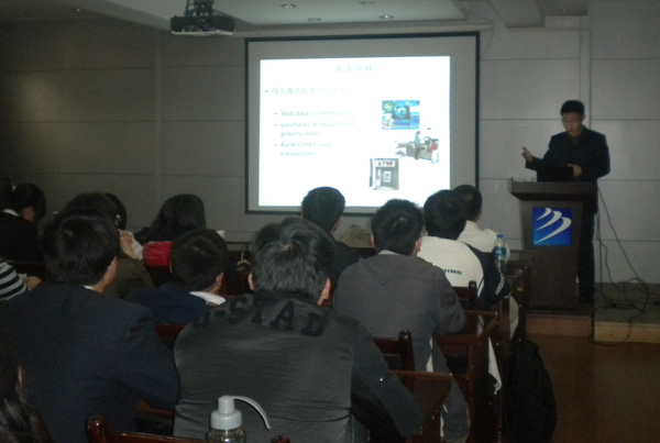 陈恩红教授从云计算开始介绍,深入浅出的例子使在场师生对云计算有了清晰的认识。接着,陈教授介绍了数据挖掘是从数据中提取出隐含的特别的,过去未知的,潜在有价值的信息,也是一门从大量数据或者数据库中提取有用信息的科学,他又从个性化推荐技术的应用与Web智能挖掘两个方面系统而深入地介绍了基于内容的、基于协同过滤的和基于潜在兴趣的个性化推荐技术及应用背景。他结合大量图例,将Web上的查询推荐进行了浅显易懂的解释。陈恩红教授的报告内容丰富,应用性突出,学术性和通俗性相结合,进一步加强了师生们对数据挖掘这一应用研究领域中的新技术的认识。