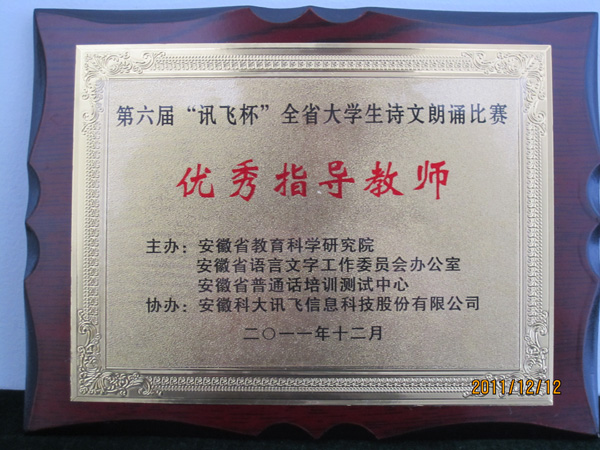 “讯飞杯”全省大学生诗文朗诵比赛由安徽省教育科学研究院、安徽省语言文字工作委员会办公室、安徽省普通话培训测试中心联合举办,安徽科大讯飞信息科技股份有限公司协办。该项比赛自2006年开展以来已连续成功举办五届,得到了各参赛高校的高度重视和大力支持。广大朗诵爱好者积极参与其中,参赛所选文稿体裁、题材广泛,展现出较高的语言功底和朗诵水平,更表现出当代大学生积极向上的时代风采。