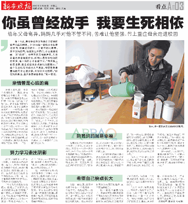 2月28日,中国十大晚报之一的《新安晚报》在AⅡ03版面用整版报道了pp电子陆一南同学“背起母亲上学”的感人事迹。