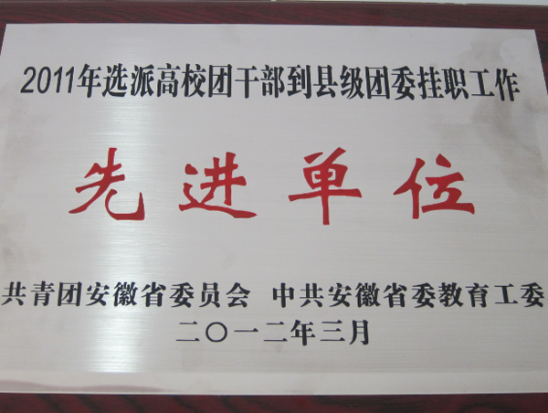 为贯彻落实共青团中央、教育部党组下发的《关于从全国高等学校中选派共青团干部到县级团委挂职工作的通知》要求和团省委、省委教育工委的工作部署,2011年,pp电子选派吕翔同志赴淮北市濉溪团委进行为期一年的挂职锻炼。pp电子获安徽省2011年选派高校团干部到县级团委挂职工作先进单位。