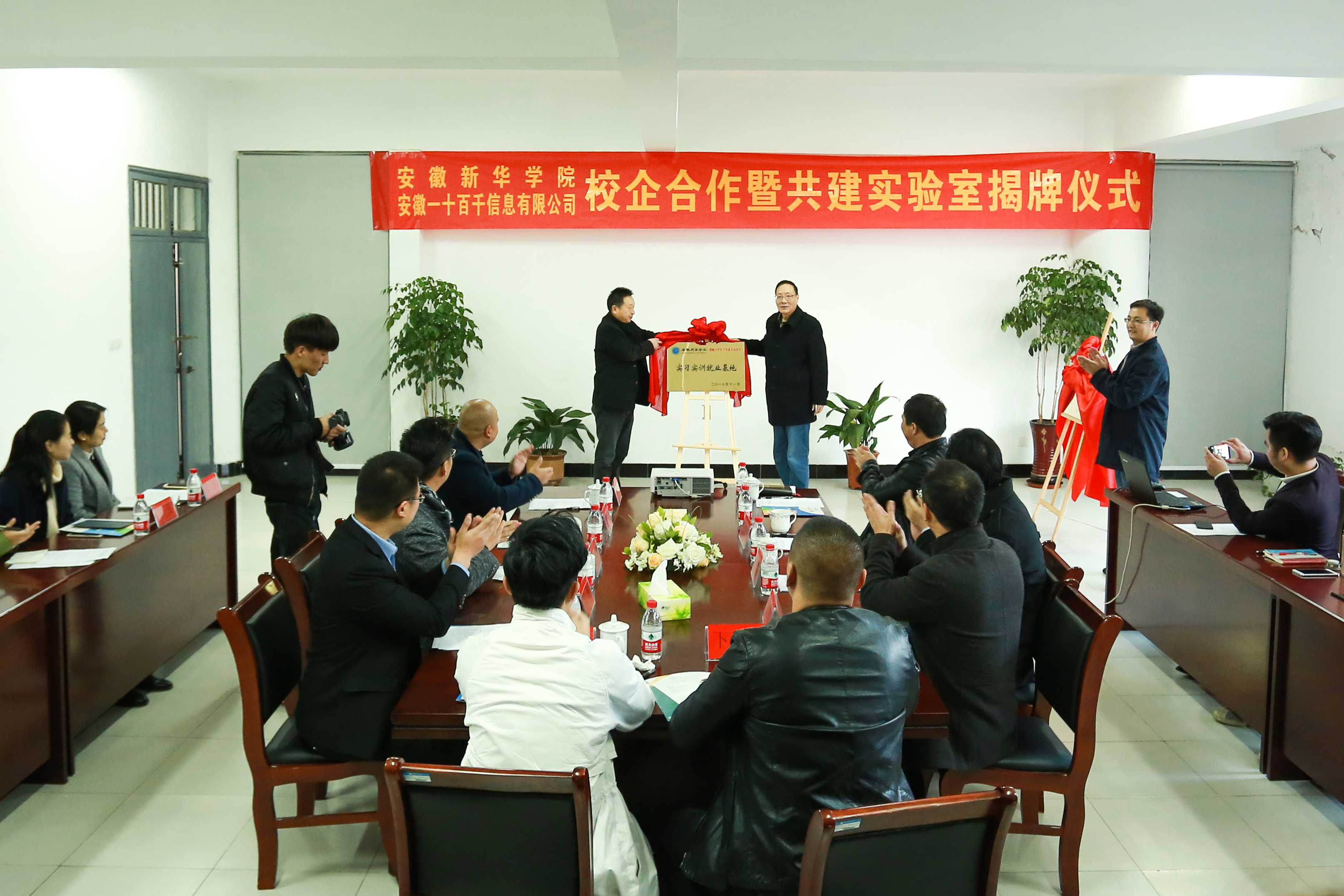 本网讯(通讯员:洪玉、彭洪磊、赵一茹)为推进创新型人才培养,提高大学生社会实践能力。11月20日,pp电子官方网站与安徽一十百千信息有限公司在文化与新闻传播学院举行校企合作暨共建实验室揭牌仪式。校长石秀和、校长助理兼教务处处长朱兆健、安徽一十百千信息有限公司总经理刘明全、安徽摄影家协会名誉主席周冰、文化与新闻传播学院执行院长翟荣兵、动漫学院副院长许存福、安徽大摄天下品牌管理有限公司总经理魏嵬、万达乐园热带雨林营销总监苏贺、创爱影像集团总经理卜晨光、聚影社影像有限公司总经理刘健出席了仪式。