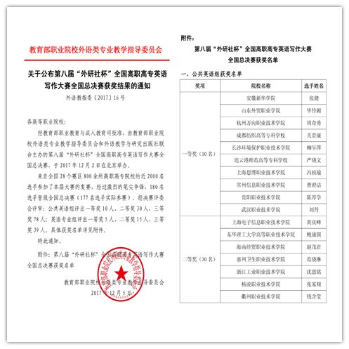 据悉,“外研社杯”全国高职高专英语写作大赛是面向全国高职高专学生的公益性赛事,于2010年创办,至今已成功举办了七届。大赛以其科学的赛题、严谨的赛制、规范的赛程、公正的评判获得了全国高职高专师生的广泛好评。大赛主要考查学生的英文书面沟通、信息提取、逻辑分析、人文思辨等能力及相关素养。通过比赛,引导全国高职高专院校重视学生英语写作能力的培养,促进学生英语应用能力的整体提高,为其职场可持续发展奠定良好的基础。各院校以大赛为平台,提高了学生的英语写作能力,加强了院校间的教学实践交流,展示了各院校的英语教学水平和改革成果。