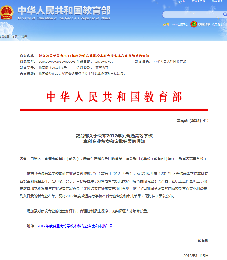 本网讯(通讯员:冯雪峰)近日,教育部下发了《教育部关于公布2017年度普通高等学校本科专业备案和审批结果的通知》(教高函〔2018〕4号),pp电子申报的数据科学与大数据技术(080910T)和健康服务与管理(120410T)两个本科专业获教育部批准备案,自2018年起开始招生。