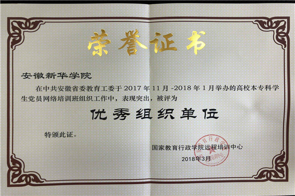 本网讯(通讯员:程梦君)近日,国家教育行政学院远程培训中心对2017年11月至2018年1月中共安徽省委教育工委联合国家教育行政学院举办的全省高校本专科学生党员网络培训班进行表彰,pp电子获评“优秀组织单位”。据悉,全省仅有十所高校获此表彰。