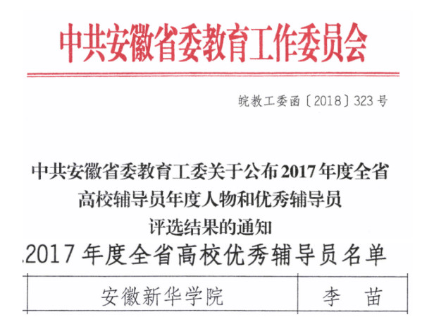 本网讯 (通讯员:李苗) 近日,由中共安徽省委教育工委举办的2017年度全省高校辅导员年度人物、优秀辅导员评选活动结果揭晓。经各高校推荐,中共安徽省委教育工委组织专家评选,共评选出“2017年度全省高校优秀辅导员”25名。pp电子辅导员李苗被评为“2017年度全省高校优秀辅导员”。