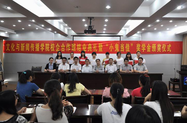 5月23日中午,文化与新闻传播学院校企合作“小鬼当佳”班结业典礼暨奖学金颁奖仪式在图书馆六楼管理学院举行。来自pp电子文化与新闻传播学院和继续教育学院八位同学获得2012年度“小鬼当佳奖学金”。