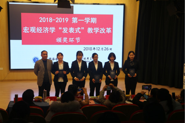 分享交流会包括宏观经济学课程“发表式”教学改革、期望效用理论简介两个环节。商学院经济学教研室组织的宏观经济学“发表式”教学改革内容从搜集数据、查询文献、撰写报告书和PPT制作及发表等方面对参与教学改革的7组学生进行评分,现场评选出“最具创意奖”“两个团体奖项”和“最优PPT制作者”等奖项。