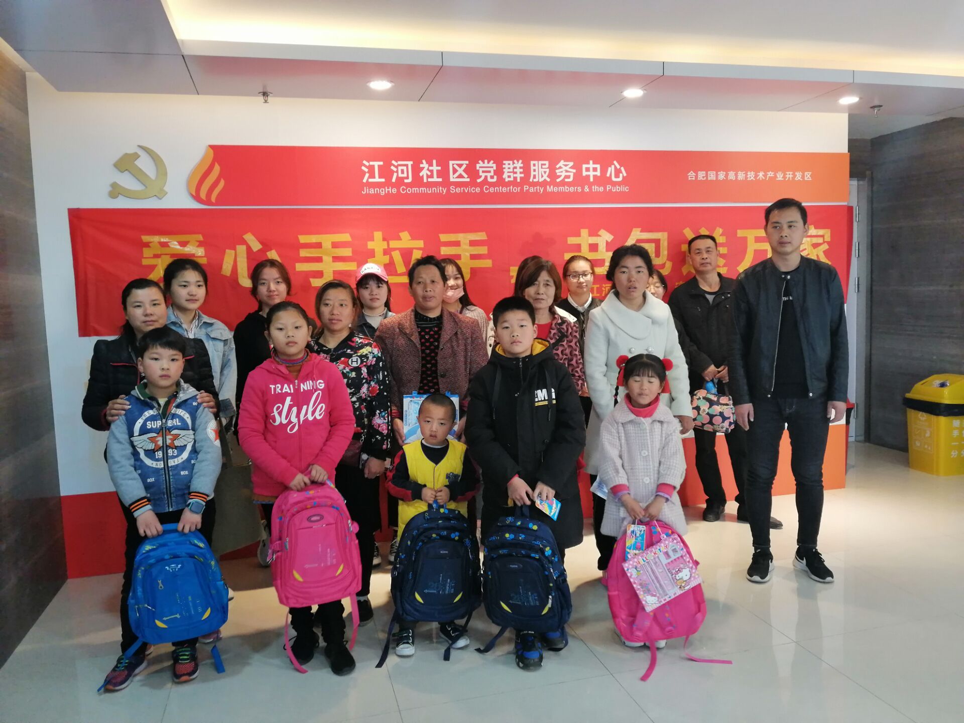 本网讯(通讯员:李苗、王光阳)为传承雷锋精神,弘扬时代新风,亲切关怀少年儿童的成长。3月17日上午,星梦汇志愿服务中心与合肥市高新区江河社区居委会、安徽知本文化传播有限公司联合开展“爱心手拉手,书包送万家”慰问活动,为社区困难家庭儿童捐赠书包。
