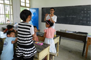 7月1日中午,实践队队员们早早的在教室调试好投影仪和电脑,等待上午召集的留守儿童前来上课。下午上课的铃声还未敲响,就有几个孩子提前来到教室,一会工夫,教室就坐满了。