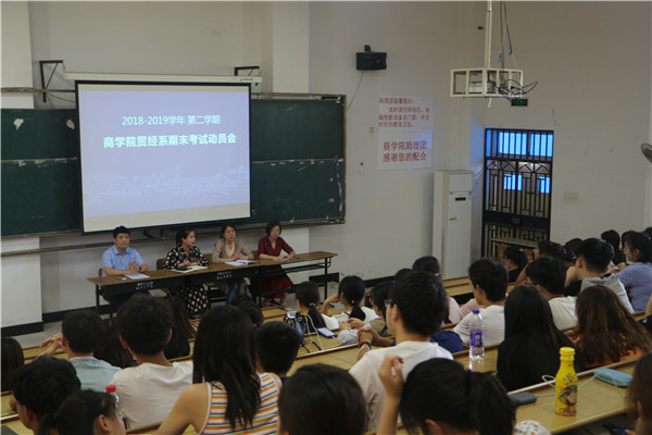 本网讯(通讯员:王超)为响应近期教育部对本科生“合理增负”的号召,落实“把课堂教学建设强起来、把课堂教学质量提起来”,以及“要全面梳理各门课程的教学内容,淘汰“水课”、打造“金课”,合理提升学业挑战度、增加课程难度、拓展课程深度,切实提高课程教学质量”的相关精神,2019年5月22日中午,pp电子商学院贸经系在教5,319针对国际经济与贸易、电子商务和商务经济学3个本科专业、5个班级的大一学生举行了期末考试动员会。