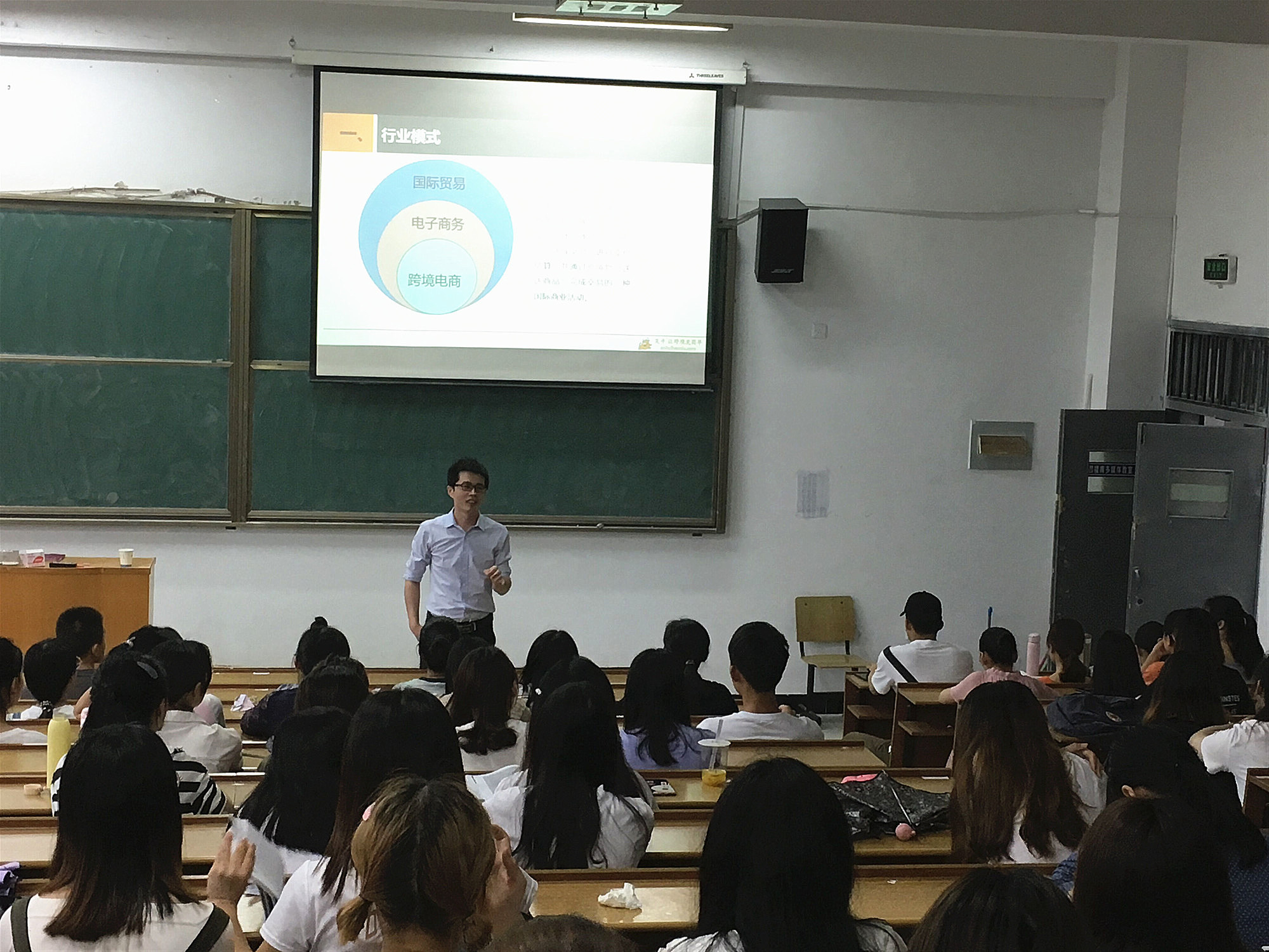 徐总首先以跨境电商的行业模式为切入点,介绍了跨境电商、电子商务和国际贸易的范畴,并结合天猫国际的实例指出跨境电商主要通过电子商务平台达成交易,通过跨境物流送达商品。他还介绍了B2B和B2C模式,比较了二者的优势和劣势。B2B以广告推广和信息发布为主, 买家的采购量大,最小起订量(MOQ)高,客户忠诚度高,产品生命周期长。而B2C以流量为主,客户群大且不稳定。其次,他介绍了国内和国际主要的跨境电商平台,包括阿里巴巴、亚马逊、易趣和脸书等。他指出GMV(Gross Merchandise Volume)是电商平台的重要参数指标和绩效指标,是已付款,未付款,退货三者的数据总和。再次,他介绍了跨境电商的相关岗位。岗位主要分为三类:平台、供应链、业务。平台岗位中重要的是摄影美工、运营推广和客服。供应链岗位包括产品调研开发、仓储和物流。业务岗位可以分为外贸员,业务跟单,外贸单证和外贸经理。他结合自身职业经历和公司的情况向同学们形象描述了各个岗位的工作要求,跨境电商行业对业务员的语言要求、对产品参数和平台规则的要求。