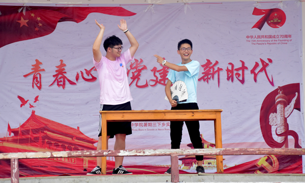 暑期社会实践“三下乡”这一路的学习与调研之余,“华园青年新思想宣讲团”给小井庄村与长庄村带来以“青春心向党、建功新时代”为主题的文艺演出。青春活力的舞蹈、逗趣幽默的相声、脍炙人口的黄梅戏、以及情意缠绵合唱《映山红》、《国家》等等。