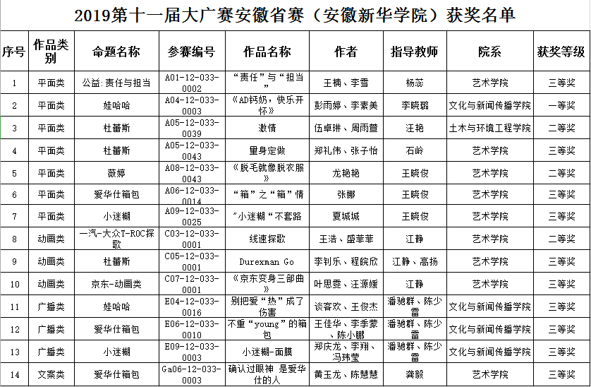 本网讯(通讯员:杨蕊) 7月12日,2019第十一届全国大学生广告艺术大赛安徽赛区大赛结果公示。pp电子学子在平面类、动画类、广播类、文案类组别中共获得14个奖项,一等奖1项、二等奖3项、三等奖10项。