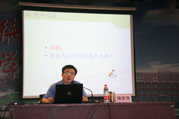 讲座分为四个部分:大学是成长之地,一个让我们不断完美的过程;大学是成才之所,要用目标引领你的大学生活;大学将推开一扇成功之门,要用能力充实你的大学生活;最后,操宏华还推荐了一些经典的书籍和电影。整个讲座在精美的PPT展示的同时,穿插了手语操《感恩的心》、歌曲《我真的很不错》、视频《中国达人秀—刘伟》以及大量典型案例,对新生大学文明礼仪、道德情操、职业规划以及校纪校规等各方面都进行了讲解,并对新生文明修身、宿舍文化建设、班级文化建设等提出了明确要求。现场掌声不断。