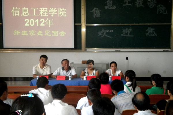 9月2日,信息工程学院在3201教室举行2012级新生家长见面会,迎接新生及其家长的到来。程家兴等学院领导班子出席了会议。程家兴向与会家长介绍了校、院的发展历程、办学特色、师资力量、专业设置、课程安排、人才培养等基本概况,使家长对该院有了进一步了解。程家兴在讲话中希望家长与学院配合,共同督促学生的成长,并相信通过学院与家长的配合及学生自身的努力,必定能够使学生迅速融入大学生活,迎接人生新的起点。随后,学院领导还与新生家长面对面进行了交流,并回答了他们所提出的有关问题。