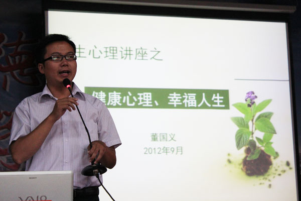 本网讯(通讯员 窦梅朋)为帮助商学院新生尽快适应大学生活,从专业的角度对处于大学阶段的同学们的心理进行分析,9月6日,由商学院主办的心理学专业课题讲座在校大礼堂举办。此次讲座分男、女生两场举办,主讲人为心理讲师董国义、凌晨,商学院2012级同学参加了此次讲座。