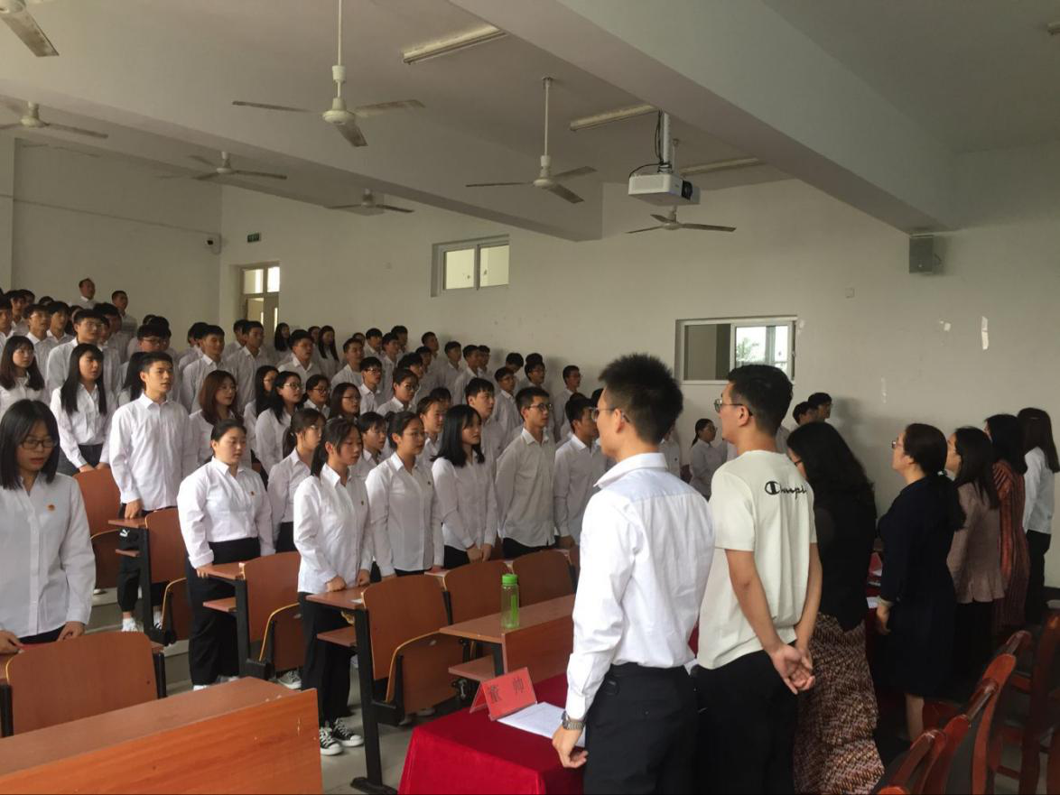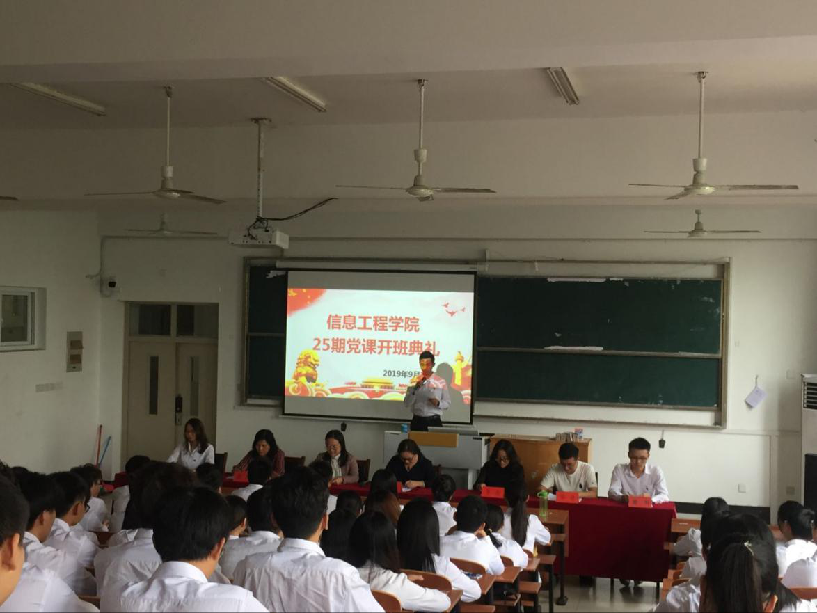 本网讯(通讯员:陈建)9月27日中午,信息工程学院分党校举行第25期入党积极分子培训班开班典礼。信息工程学院党总支书记、执行院长盛晓青,组织委员彭智,学生第一支部书记李苗,学生第二支部书记陈红,组织员陈建以及140名学员参加典礼,典礼由陈建主持。