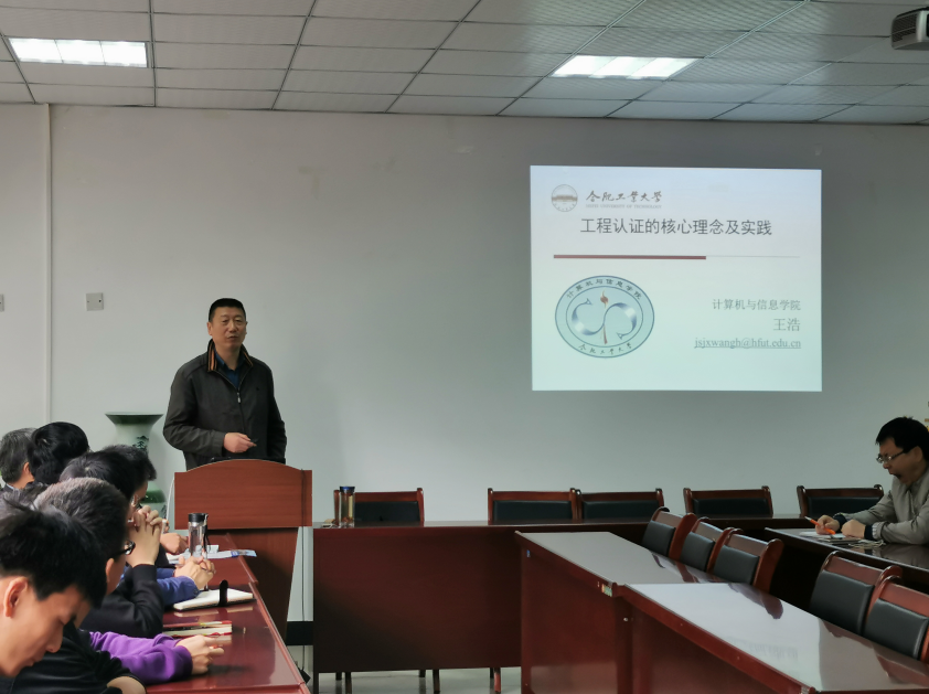 本网讯(通讯员:石文玉)10月16日下午,信息工程学院特邀合肥工业大学计算机与信息学院王浩教授来pp电子作题为“工程认证的核心理念及实践”的报告。报告由信息工程学院教学副院长万家华主持,信息工程学院院长吴建国及全体教职员工、土木与环境工程学院副院长谢汝强及部分专业教师代表、电子工程学院部分专业教师代表参加了本次讲座。