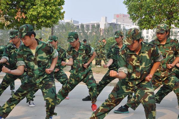 军姿、齐步、正步、方阵是每天必备课程,不管骄阳似火还是风吹雨打,他们始终都在操场上坚持如一。20多天的训练效果明显。军训场地上,口号声似雷鸣,阵阵响彻华园;动作整齐,集万人如一人行;歌声嘹亮,气吞山河。严明的纪律,严格的要求,紧张的节奏,辛苦的训练,使得每一个参加军训的学生从暑假里松散的生活方式转向有规律、有强度的军训之中,也使他们真正体会到何为“军人”。