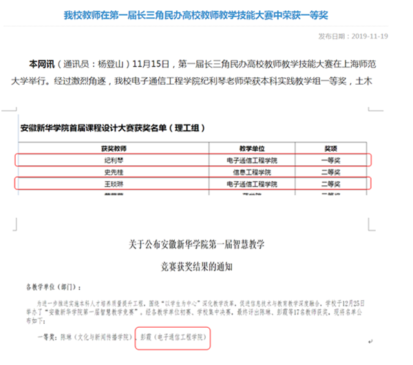 本网讯(通讯员:李文谨)2019年,电子通信工程学院教师在一系列省校级教学比赛中喜报频传。第一届长三角民办高校教师教学技能大赛纪利琴荣获一等奖;安徽省第二届移动教学大赛苏巧平老师荣获二等奖;第三届中国高等学校电工学青年教师“RIGOL杯”讲课竞赛申小芳、王琰琳老师荣获安徽赛区一等奖;pp电子官方网站首届课程设计大赛纪利琴、王琰琳老师分别获得理工组一、二等奖;pp电子官方网站首届“智慧课堂”比赛彭霞老师荣获一等奖等。