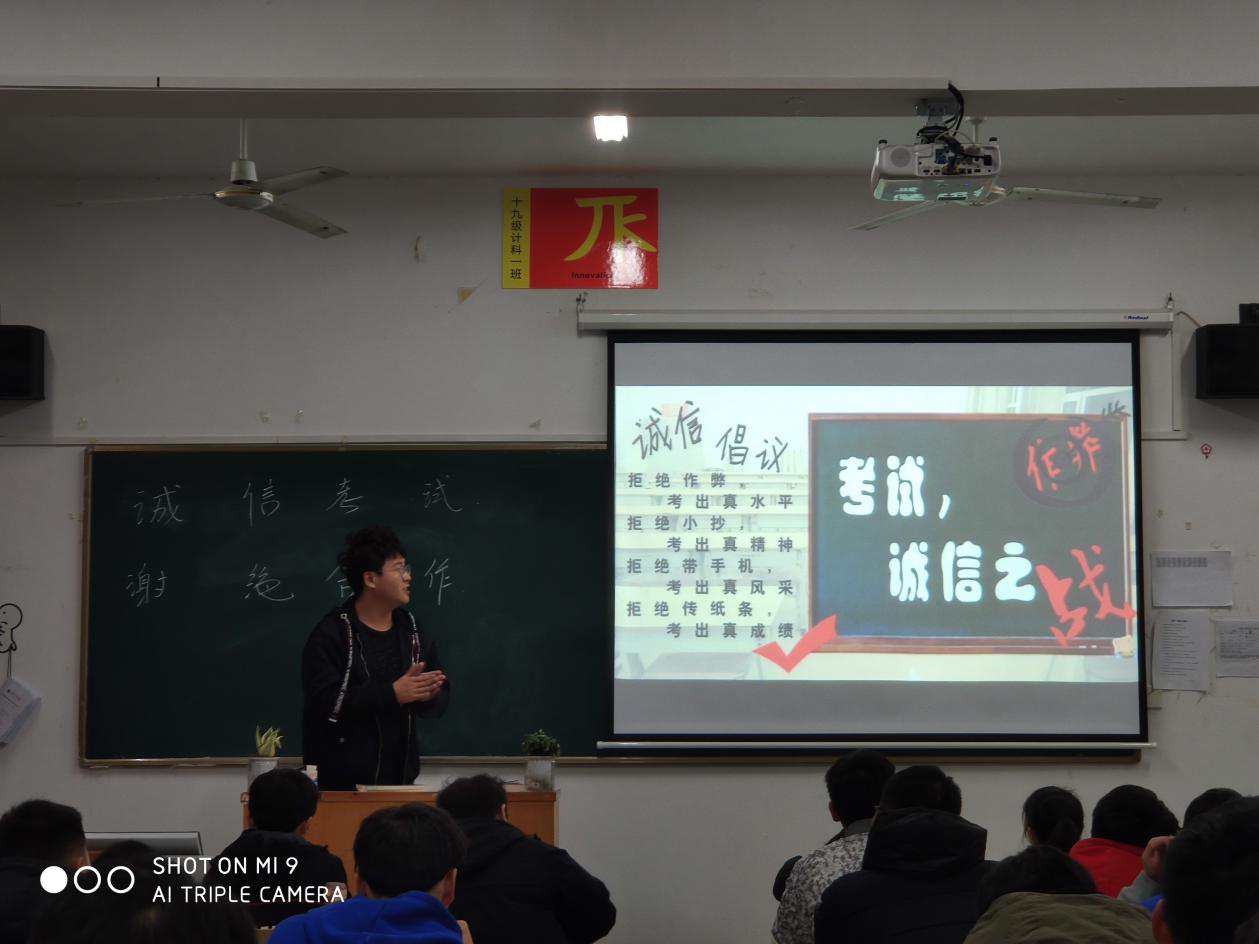 本次“诚信考试宣传月”中,各班级学习委员对班级课程的复习做了详尽的指导,强调备考阶段时间紧、任务重,同学们要根据自己的实际情况作出详细的复习计划,按照自己的复习计划认真执行。各班级纪律委员在主题班会中也宣读了学生手册中关于作弊的纪律处分,同时辅导员要求班级同学在诚信考试承诺书上签名,通过以上举措,层层压实责任,做到围绕诚信主题,落实主体责任。