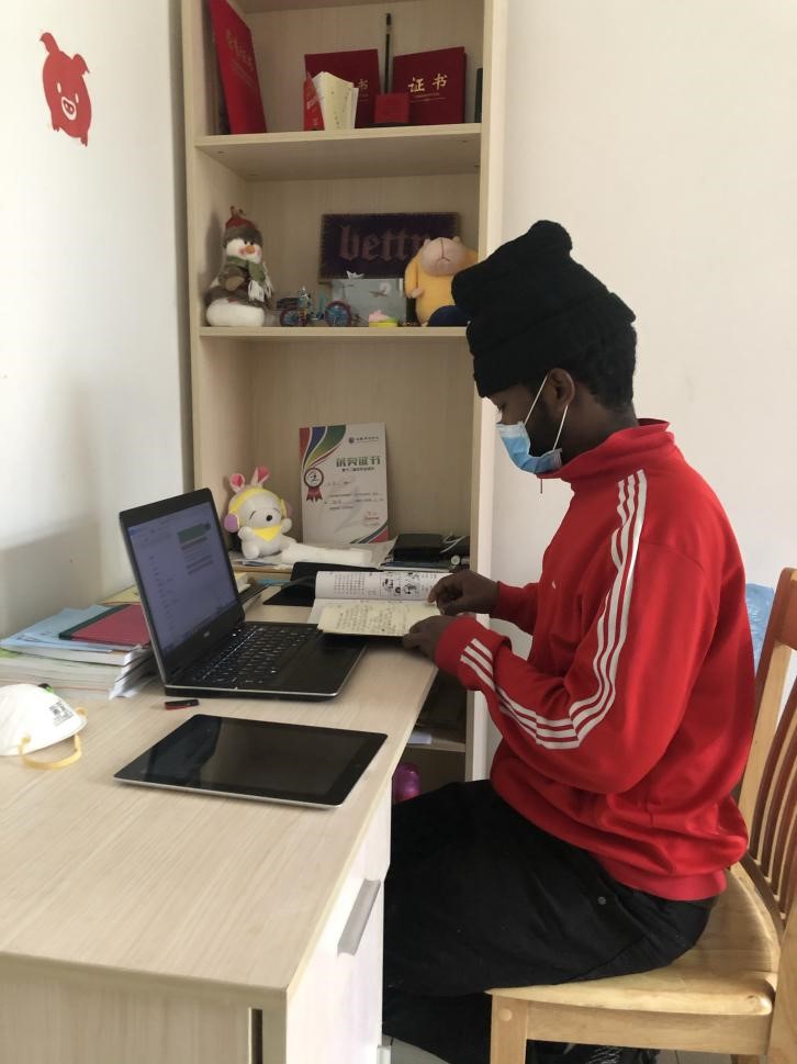 安静的校园,较平时单一的生活,这些都阻挡不了埃塞俄比亚学生旻特对汉语的学习热情。每天除了量体温、配合学校值班人员消毒,吃简单的食物,其余时间旻特总是坐在书桌前认真地在线听课或完成老师布置的课后学习任务。闵特说“这种授课方式很新颖,同学们和老师可以在线互动,仿佛和课堂上一样”,其他留学生们也纷纷反馈在线教学效果良好,充实了疫情期间的生活。