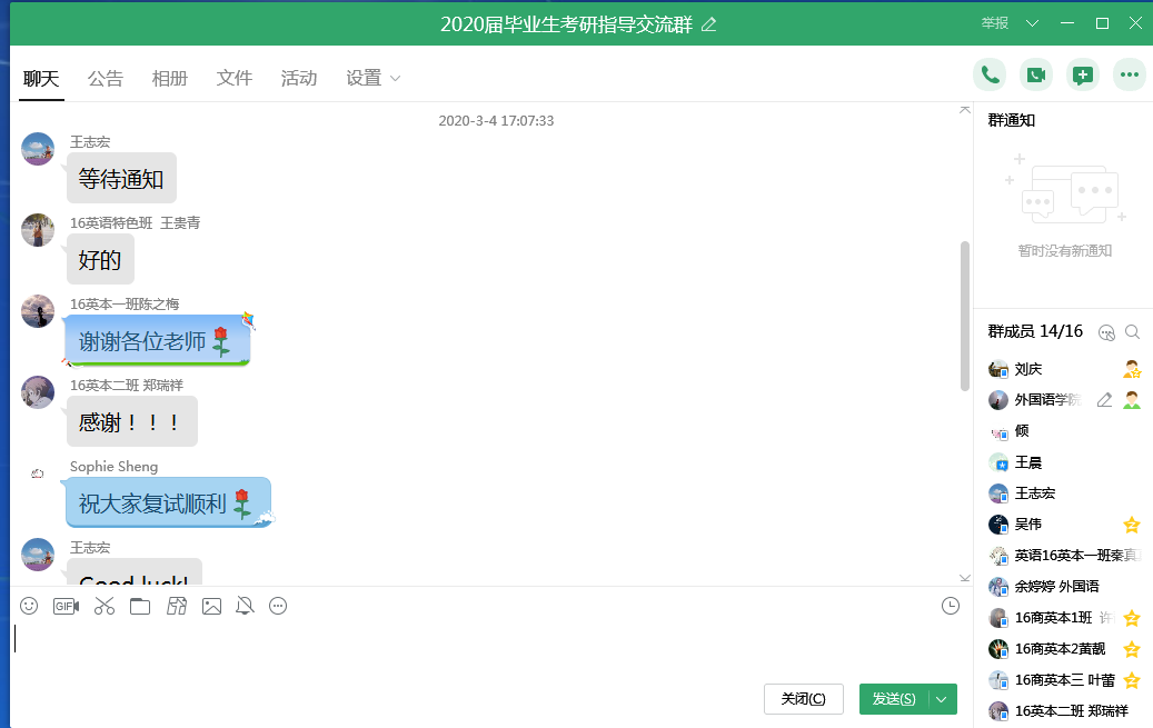 本网讯(通讯员:王婷)新冠病毒感染的肺炎疫情当前,为全面深入推进2020届毕业生就业工作,促进特色就业,3月4日下午,外国语学院针对2020届考研毕业生,开展了线上复试指导交流会,为考研学子送去浓浓暖意。外国语学院教学副院长王志宏、教师代表盛素雯、余婷婷、黄亚萌、王晨、行政秘书王婷以及毕业班辅导员和全体2020届考研毕业生参加了线上会议。会议由王婷主持。
