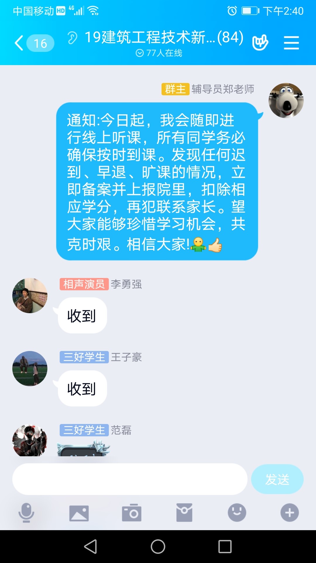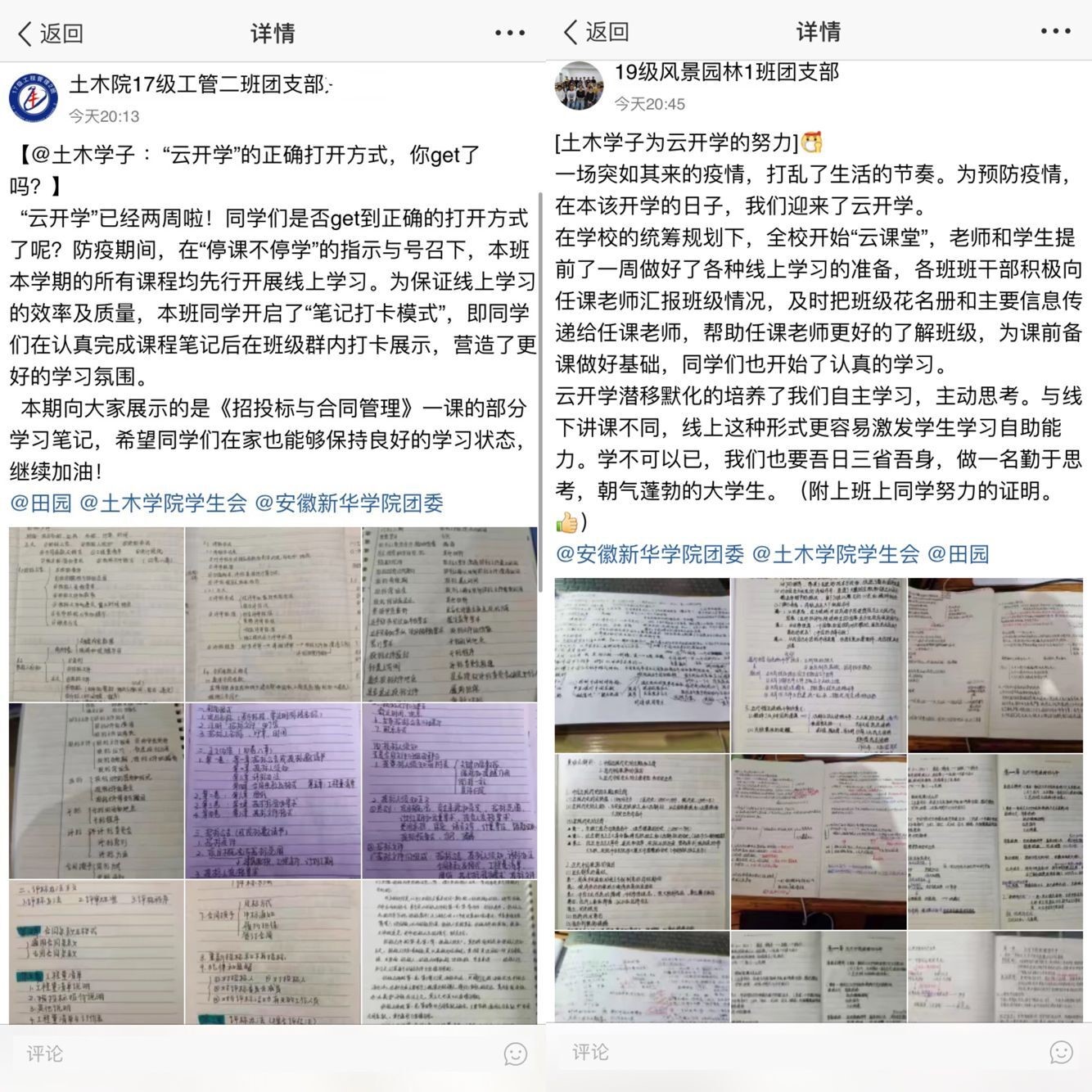 各班辅导员定期深入网络课堂进行听课,掌握学生上课纪律,查看有无旷课迟到早退等现象发生,了解学生线上学习效果于出现的问题,并及时沟通解决。在课下辅导员们积极与各科任课老师取得联系,及时了解学生上课情况,以及上课过程中存在的问题,进行针对性的处理,并在课后通过与班长、学习委员等班委之间的联系,收集整理学生存在的问题和建议。除此之外,各班级辅导员还采用课堂笔记展示、随机提问课程进度等多种方式检验和激励学生的学习效果。