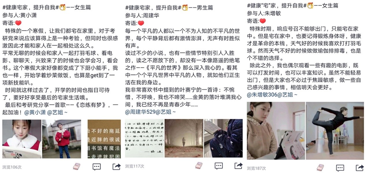 疫情当前,生活向前。为保障团员青年在疫情防控期间的身心健康,本次活动还提倡“健康宅家,提升自我”的理念,引导广大团员青年打卡“学习强国”、开展室内运动、学习新技能、阅读经典名著、观看《中华诗词大会》等优秀电视节目,定期分享健康“宅”家的收获与学习心得。