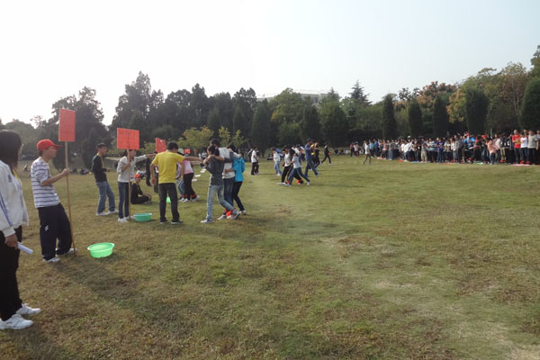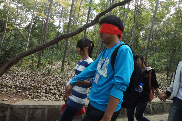 登山期间,还设置了一些互动节目。第一大队准备了“共享蜀山碧水蓝天,争做时尚绿色先锋”的横幅在登山的过程中邀请游客签名并向其宣传环保观念。同时志愿者在通往大蜀山的路途中设置“关卡”等待各个登山小队到来“对答环保问题”,题目都是有关环保方面的,答对了就可以顺利的向大蜀山迈进,如果答错了大队中就必须表演一个节目方可通行。还有那有趣的“盲行”,男女合作,先将男生眼睛蒙上,让女生搀扶男生行走;再让男生和女生交换角色,增加大家之间的信任度加强协会内部与外部的合作与交流。素质拓展期间开展了许多有意思的活动,有小组特别展示、缩小包围圈游戏、拯救行动游戏、抢收抢种、万里长城永不倒。名人湖草坪闪烁着一群志愿者的欢快身影,他们的脸上洋溢着笑容。通过这些活动希望同学们在游戏的过程中关注环保,体会快乐。志愿者们在登山过程中,通过语言宣讲、口号、游戏、环保行等方式,向来大蜀山游玩的游客以及周边居民宣传环保理念和知识,让游客和居民在游玩中关注环保,在环保实践中体会快乐。行动更好地保护、美化蜀山的自然风景!清除山上的垃圾,还大蜀山一个美丽的容貌。通过登山,来释放工作、学习的压力,调节人的身体和心理平衡,有益于登山者的身心健康。素质拓展 是以培养合作意识与进取精神为宗旨,崇尚自然与环保,增强团队活力、创造力和凝聚力,达成提升团队生产力的目的。