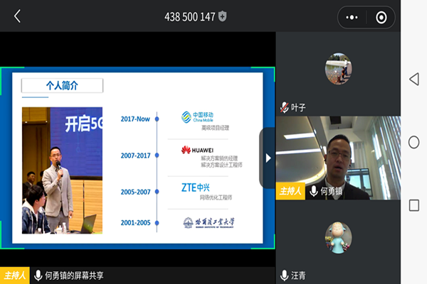 报告伊始,汪青向广大老师和同学们介绍了何勇镇经理。何勇镇经理曾就职于中兴通信股份有限公司,华为技术有限公司,参与我国第一代自主3G技术的网络测试及优化工,以及第一代4G网络多个国家的全球商用。目前负责5G垂直行业应用及政企ICT项目。