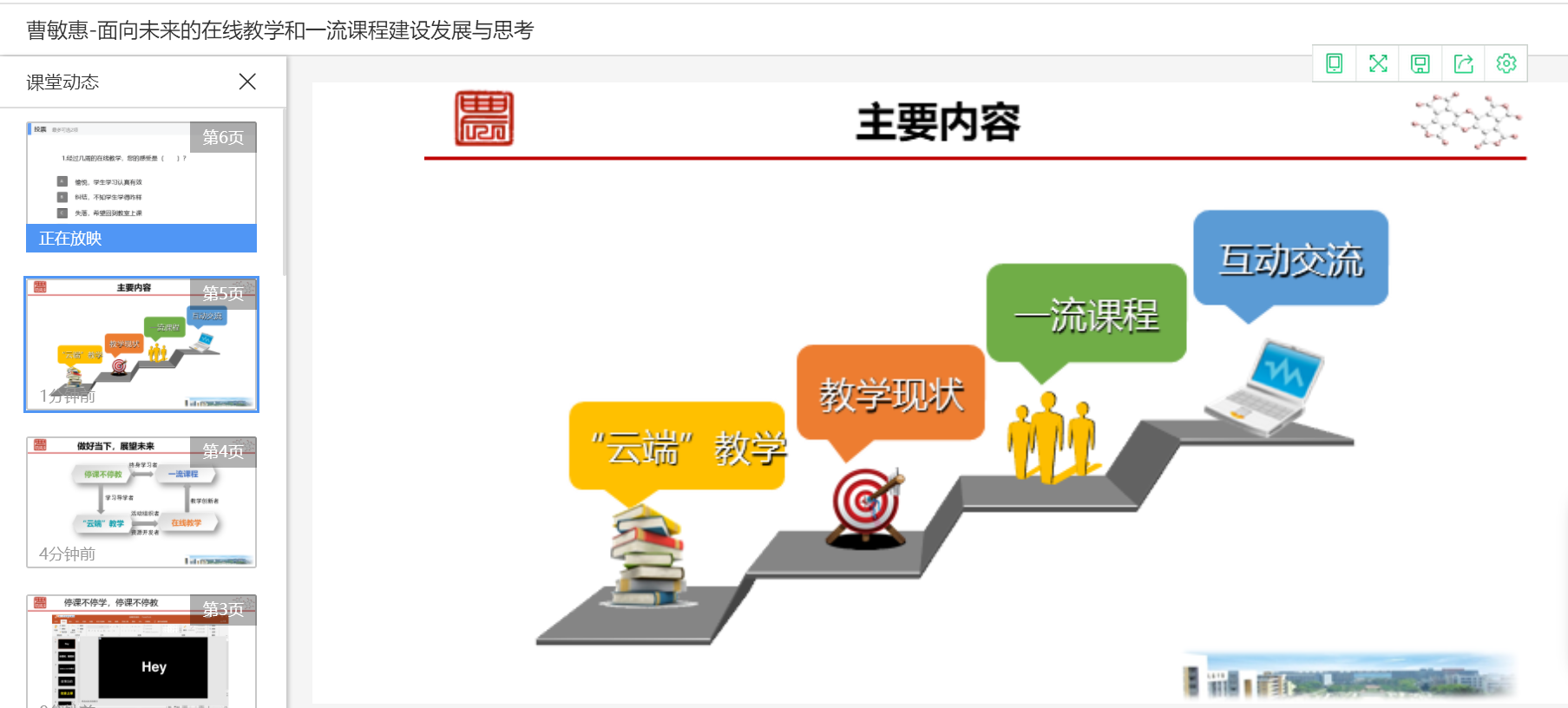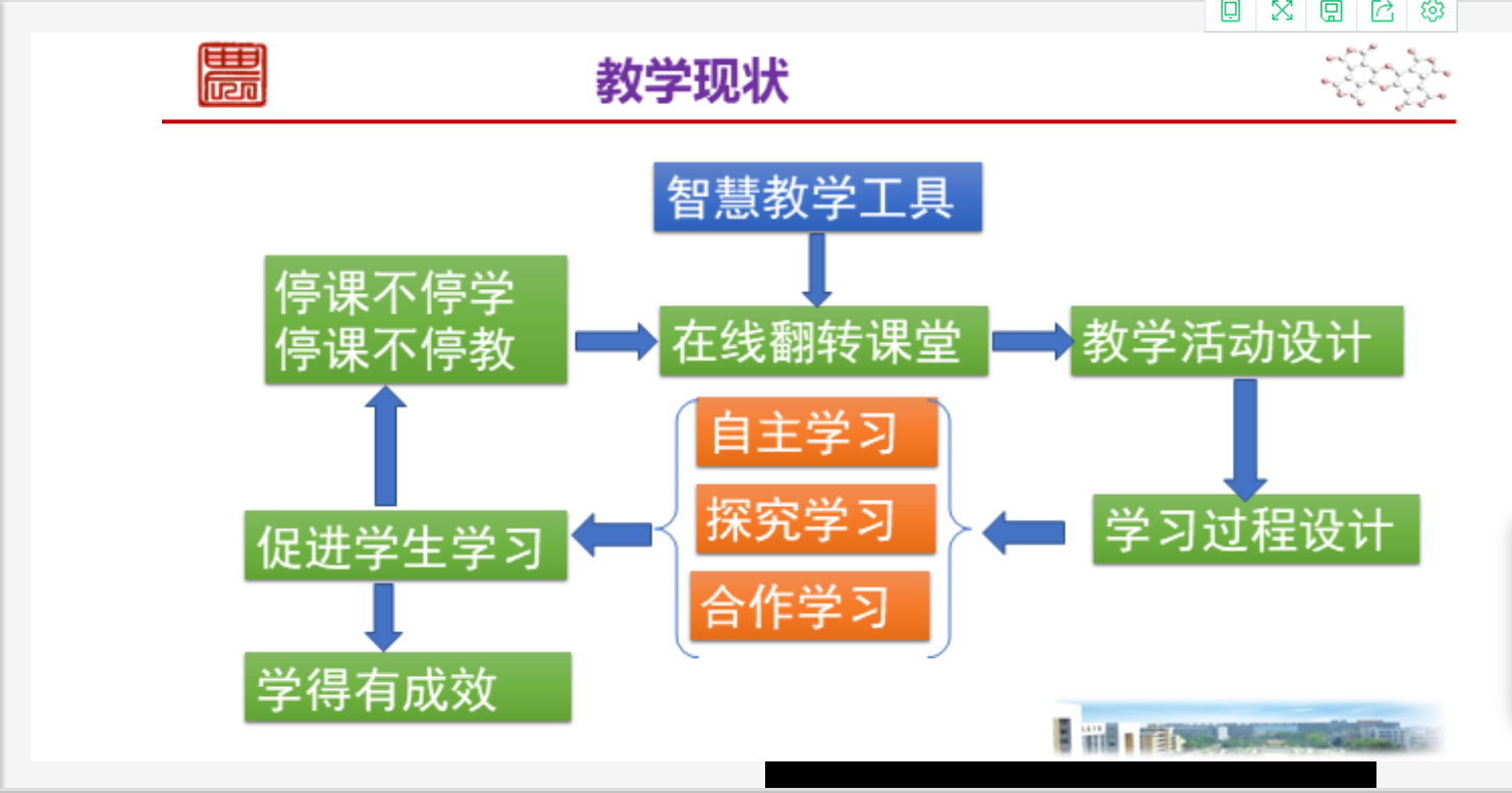 本次培训以“面向未来的在线教学和一流课程建设的发展与思考”为主题,华中农业大学曹敏惠副教授主讲。曹敏惠从“云端教学”、“教学现状”、“一流课程”和“互动交流”四个方面展开,结合自己的教学经验,阐述了如何架构“云端”课堂及四种不同的线上教学模式,分析了目前线上教学中出现的技术困境和问题,从教师和学生的角度提出了自己的建议,并详细解读了教育部对一流课程建设的实施意见。