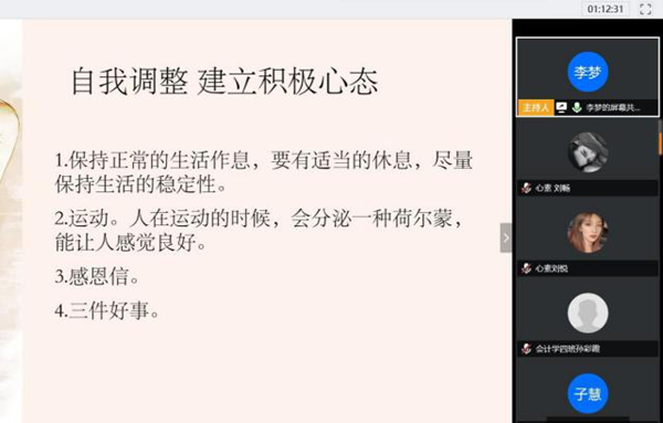 李梦从在疫情期间学生可能面临的压力事件进行分析,引出学生可能出现的负性情绪,特别是因疫情而产生的心理应激反应没有得到有效的应对而引发的心理危机,进一步强调了心理委员工作的重要性。随后,李老师从“评估方法”和“谈话技术”两个方面,讲授在线上开学期间如何深入全面了解同学们心理健康状况,对于心理不健康及心理异常学生做到及早发现、及时报告、提前干预,维护好同学们心理健康。最后,李梦和同学们分享了在疫情期间自我调适的方法,如调整自己的思维方式、觉察情绪、调整自己的作息习惯及如何积极沟通等。最后再次介绍了pp电子心理健康线上服务资源,欢迎有需要的同学进行线上咨询。培训结束后,李梦鼓励心理委员积极宣传心理健康知识,做好班级心理健康的守护人,并叮嘱同学们做好自身防护和自身心理状态的调整。