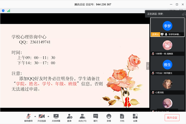培训中,李梦从学生心理困扰类型、评估方法、谈话技术及自我心理调适四个部分与心理委员分享了在疫情期间班级心理工作的方法和重点。