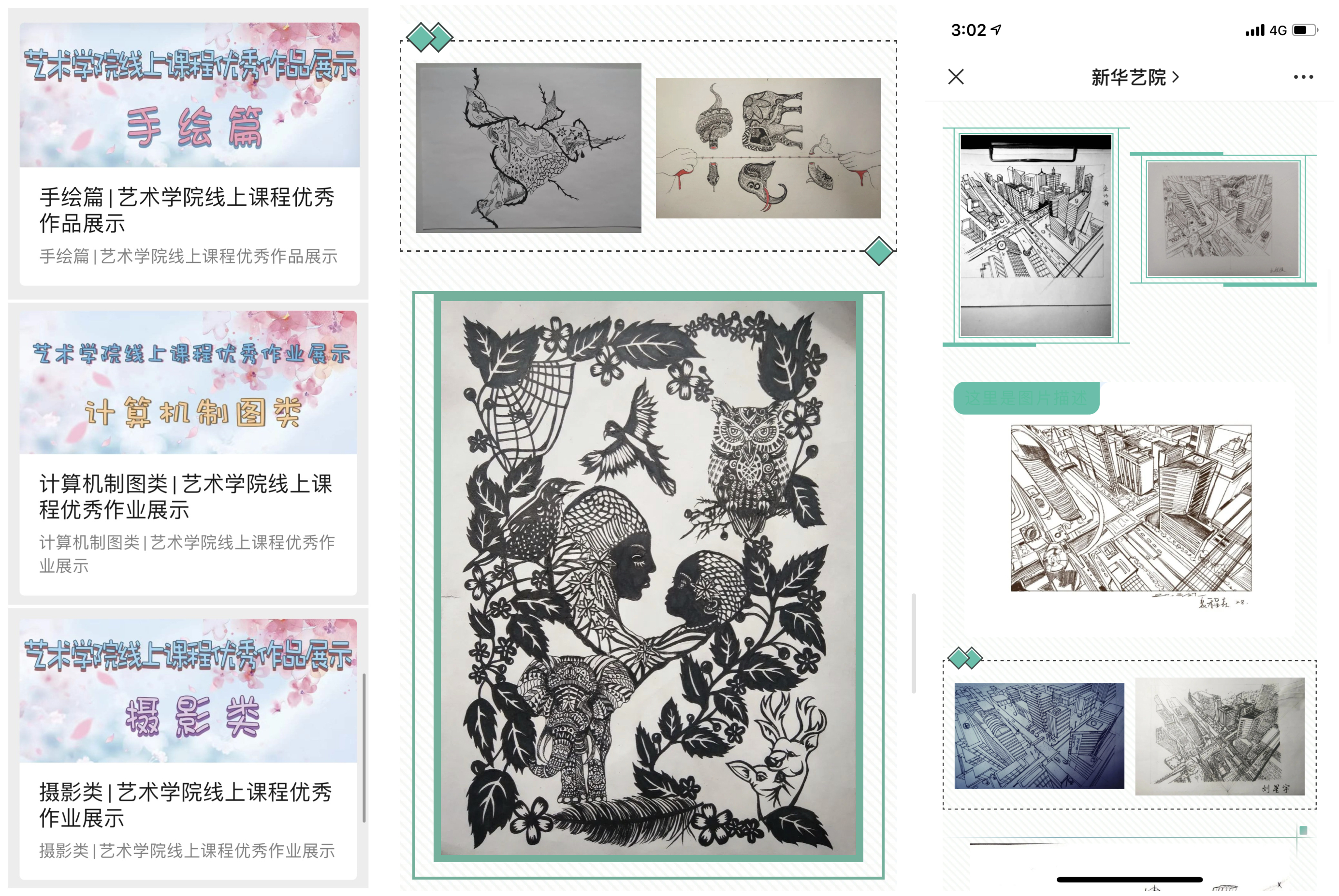 本网讯(通讯员:杨蕊,王静)为进一步提升艺术学院线上教学质量,激发学生创新潜能,艺术学院开展“艺战疫作、云端共赏”线上教学成果展,本次活动涉及39门次的线上课程作业,共计3000余幅作品,经过授课教师推荐,专业负责人、系主任及教学工作委员会的逐层评选,最终评选出手绘类、计算机制图类、摄影摄像类三类优秀作品100余幅,通过“新华艺院”官微推送,实现云端共赏。