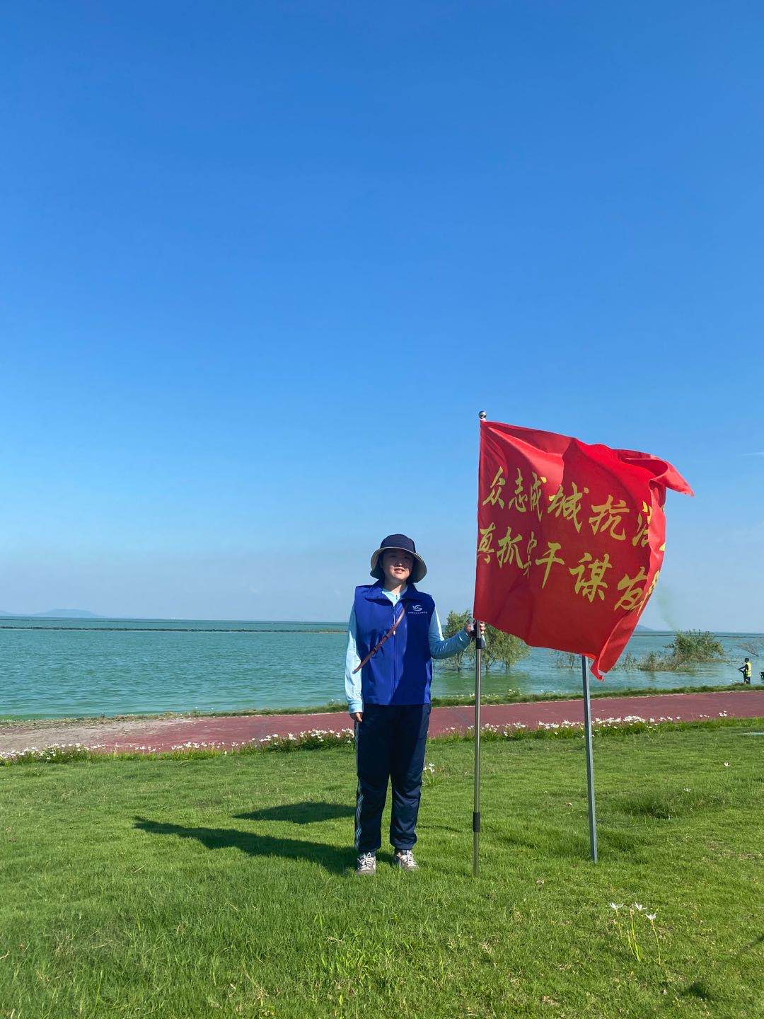 汛情发生以来,包河区政府积极部署防汛抗洪工作,包河区志愿服务联合会积极组建志愿服务团队并召开志愿者培训会。艺术学院辅导员高扬得知消息后,第一时间申请志愿者报名,在参加培训后开始了正式防汛抗洪志愿服务工作。根据包河区志愿服务联合会的统一工作安排,高扬值守的路段在巢湖大堤卫王段,主要工作任务是巡查大堤。巢湖是合肥重点旅游点,恰值暑期盛夏,前往游客较多,给安全管理工作带来诸多不便,高扬负责值守路段内保证游客不得逾越安全警戒线,这期间有大量的劝阻和引导工作,同时,还需协助在安全警戒线以外作业的士兵们。烈日当空,每一次值班都要工作一整天,高扬和她的队友们,相互鼓励,相互帮助,毫不退缩。