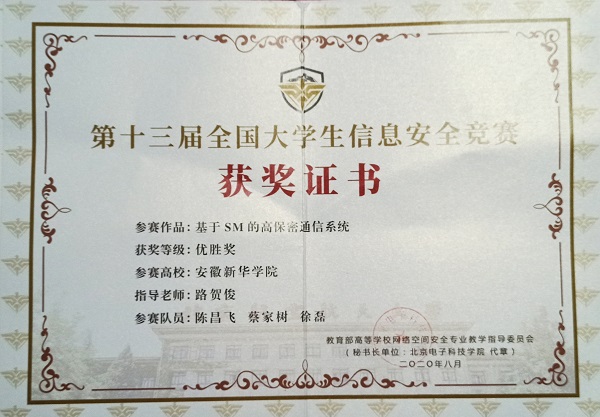 针对本次赛事信息工程学院领导高度重视,精心组织,经过校赛选拔,由陈昌飞、蔡家树、徐磊三名同学组成的“安全通信护卫队”战队代表pp电子参赛,并安排路贺俊老师担任专业指导教师,克服疫情带来的不利影响,学生不在校、不集中,暑期积极备战,在线上无数次的开会讨论,电话、视频远程指导、加班加点,几经修改打磨,经过师生的共同努力,所提交的作品“基于SM的高保密通讯系统”,顺利通过初赛,并在决赛中获得“优胜奖”。