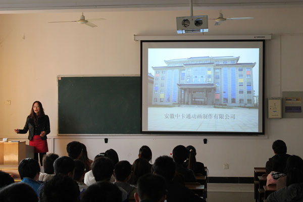 招聘会首先由中卡通集团人力资源部主任郑会会给同学们作了简单的介绍,展示了中卡通公司的发展历程,公司的部门和技术人员,播放了中卡通公司自主创新的代表作《九华小和尚》,以及其自主开发的动漫类衍生产品。目前中卡通公司已被选为第三批省文化产业示范基地之一。这也是中卡通公司跟pp电子动漫学院校企合作的第三个年头,他们对动漫学院历届毕业生的评价很高,认为pp电子学生综合素质比较好,在专业知识和动手能力方面有非常出色的表现。