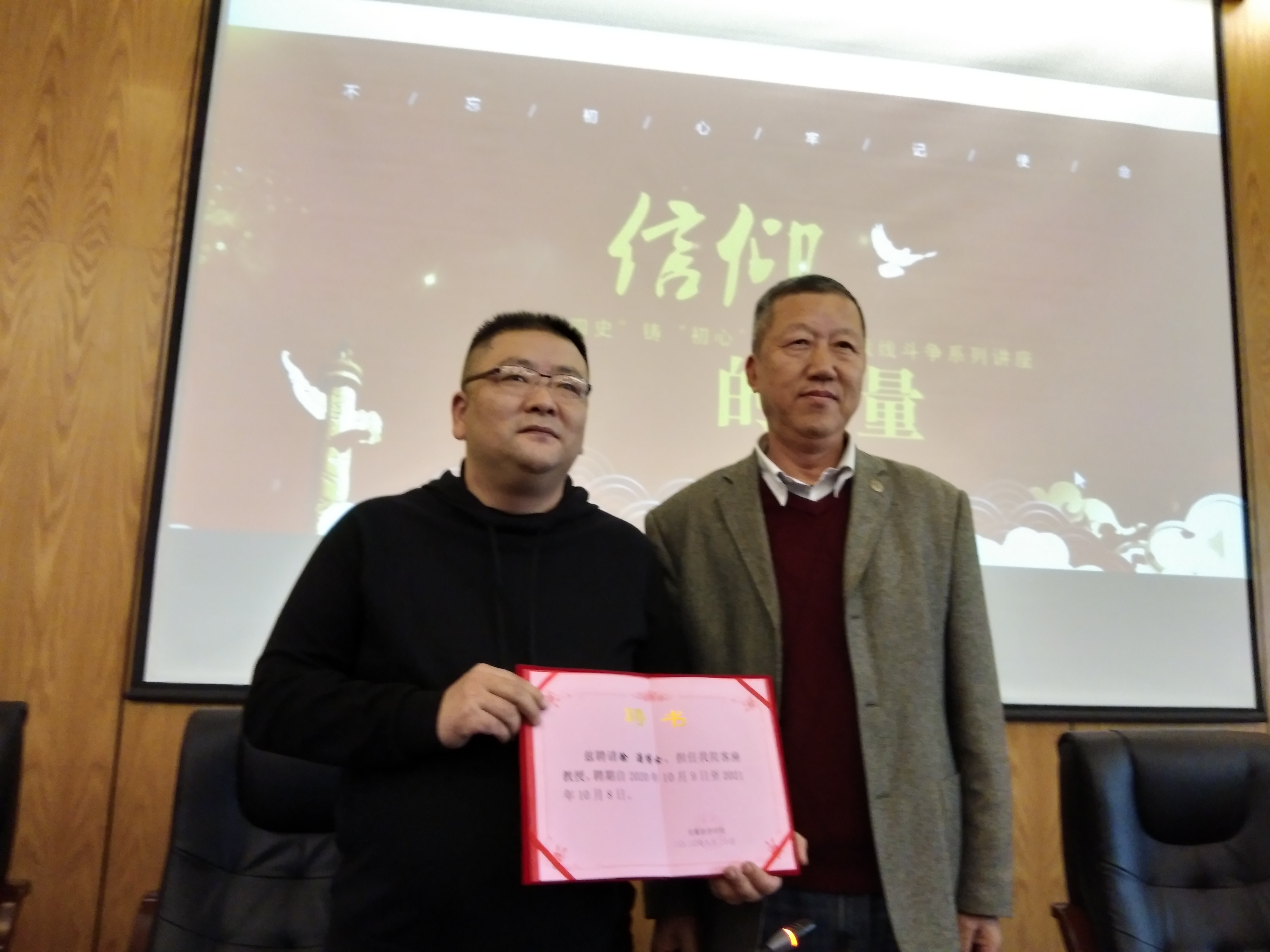 本网讯(通讯员:张爱丹)为深入学习贯彻习近平新时代中国特色社会主义思想,进一步促进广大师生坚定理想信念、传承红色基因、激发爱国力行。10月21日下午,马克思主义学院特邀西南交通大学马克思主义学院党的隐蔽战线研究团队评审专家、安徽省党史学会理事、红色作家徐涛来pp电子做专题讲座“信仰的力量”。本次讲座由马克思主义学院院长何小刚主持,并代表学校向徐涛颁发客座教授聘书。