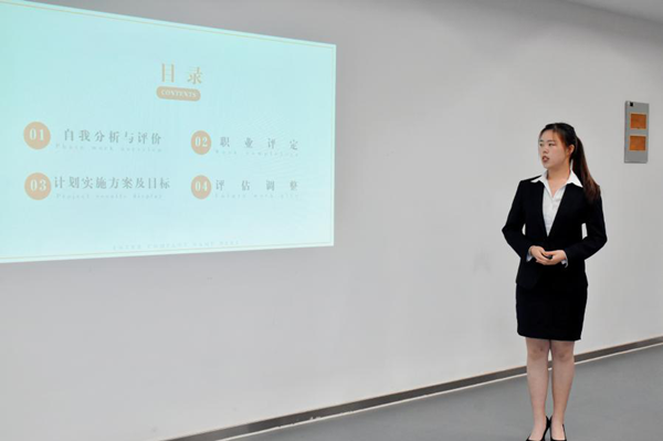 之后,来自职业生涯规划大赛的三组选手向评委们作出了他们的职业生涯规划。其中,来自2019级新闻学1班的郑梦竹展开自我分析与评价,并对于自我职业生涯规划的环境阐述了认知,同时表达了自身坚定的目标。最后,王晗宇作总结发言,他指出:“在各组展示结束后可以看到其中的创新性所在,相信未来大家的想法会日趋完善。发扬大学生创新创业精神,提高实践能力和综合素质。”