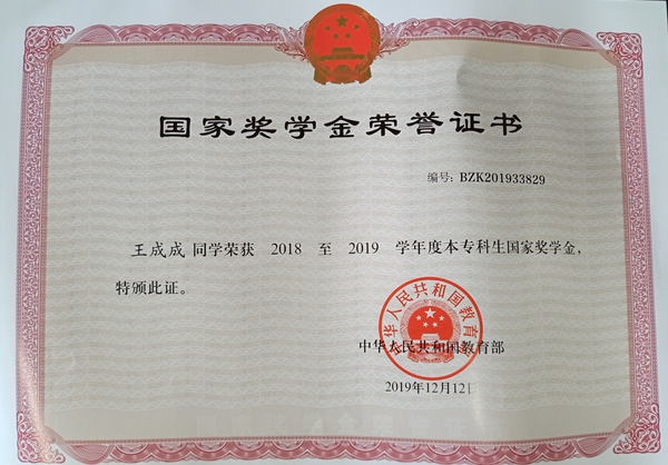 大学的学习要克服很多外界的干扰和自身的浮躁。当身边的同学在尽情享受大学生活时,王成成则是图书馆、自习室的常客,总是一大杯白开水,找个安静的角落一坐就是一整天。通过三年的努力,他的学业成绩始终保持专业第一,先后获得2017-2018学年国家励志奖学金、2018-2019学年国家奖学金、2019年度中国电信奖学金·飞YOUNG奖。