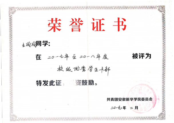 王成成是师生公认的学习标兵,通过自己的努力取得了同龄人难以企及的成绩,但是他对关心和帮助他的同学们心怀感激,总是尽己所能地去回报集体。在他的带领下,班级(社团)同学参与公开发表论文2篇、申报创新创业训练项目3项、2018年在第八届全国大学生机械创新设计大赛(省赛)三等奖、2019年在“安徽省高校研究生信息素养大赛”优秀奖、2020年Mathematical Contest In Modeling(美国大学生数学建模大赛)三等奖等。