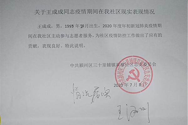 2020年新冠肺炎突如其来,面对疫情王成成同学毫不退缩,主动报名参加当地三十里铺镇双寨社区社区志愿者。几个月来,他总是抢在最前线,如同他所说:如果没有国家的助学扶持,我也不会有机会读大学,我要用自己的实际行动,回报社会。
