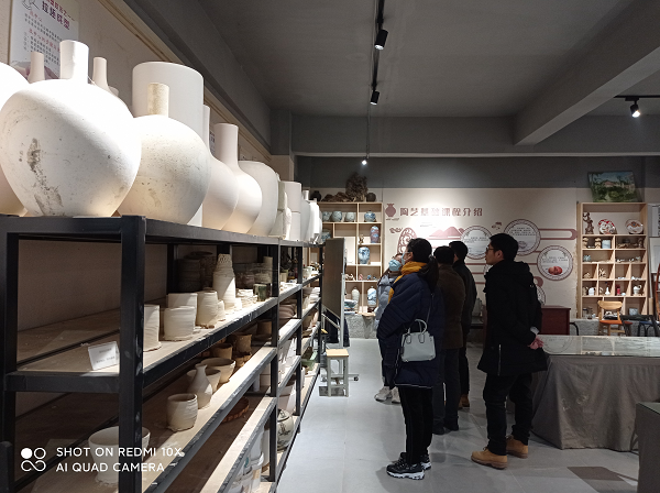 首先参观合肥财经职业学院陶艺馆,负责人朱水江介绍总体概况,该馆主要为艺术设计专业、广告艺术设计专业等4个专业提供陶艺实训,同时面向全校的陶艺爱好者提供陶艺体验。详细介绍陶艺教学从练泥、拉坯、印坯、利坯、晒坯、刻花、施釉、烧窑、彩绘、釉色变化的全过程。