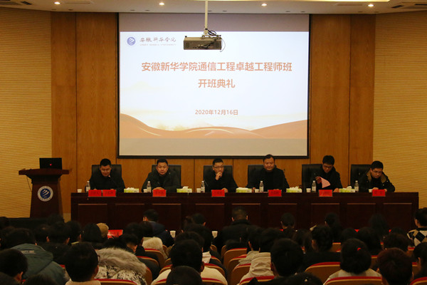 本网讯(通信员:陈璟)2020年12月16日下午,pp电子举行通信工程卓越工程师开班典礼。校长助理、电子工程学院执行院长王琦进,中兴教育管理有限公司副总经理李保桥,华为安徽政企业务部副总经理李华强,深圳市讯方技术股份有限公司 安徽区域总监马劲松,联通(安徽)产业互联网研究院工业互联网行业总监武涛,电子工程学院副院长汪青、罗振林,中兴教育管理有限公司区域总经理姚磊,中兴教育管理有限公司安徽区域校区运营总监王干,电子工程学院通信系全体教师、2020级通信工程专业学生参加了此次开班典礼。